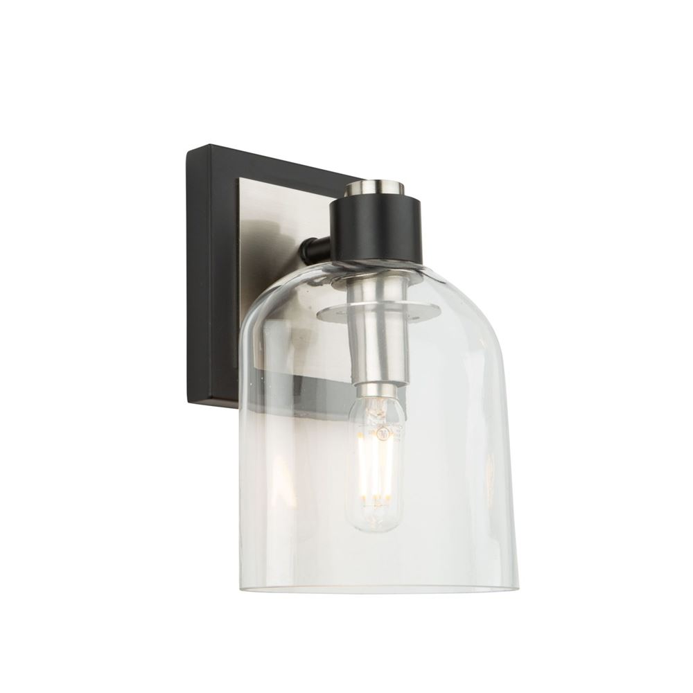 The "Lydon Collection" of bathroom vanities is slick and clean - a perfect compliment to any environment that is modern to transitional. The clear glassware has circular edges. The arms are finished in black while the accents are plated in nickel. Shown as a single sconce but also available in a 3 or 4 light version.