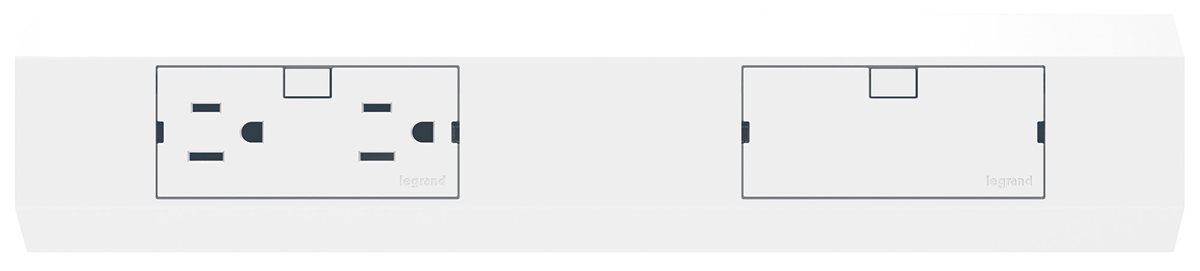 Includes one Tamper-Resistant Outlet Module and one Blank Module. Can support up to two LED lights. Provides 120V power via 15A outlet modules and 20A pass-through. Module openings are 6” on-center.