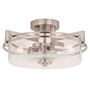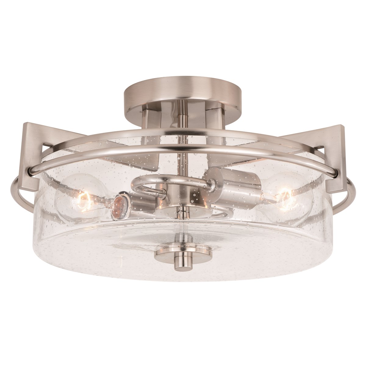 Flat metal arms finished in satin nickel partnered with cylinders of clear seeded glass bring