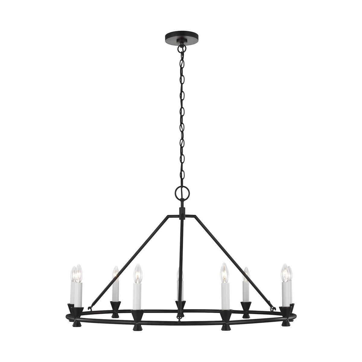 An exposed candelabra pairs with an angular, Aged Iron frame to ensure the Keystone family casts a warm and inviting glow. This series of chandeliers, sconces and pendants designed by Chapman & Myers for Generation Lighting features very detailed construction including bobesches supporting each candle tube. The chandeliers highlight the popular wagon wheel silhouette.