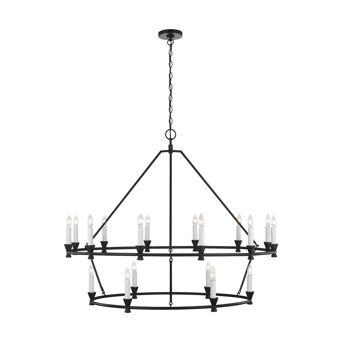 An exposed candelabra pairs with an angular, Aged Iron frame to ensure the Keystone family casts a warm and inviting glow. This series of chandeliers, sconces and pendants designed by Chapman & Myers for Generation Lighting features very detailed construction including bobesches supporting each candle tube. The chandeliers highlight the popular wagon wheel silhouette.