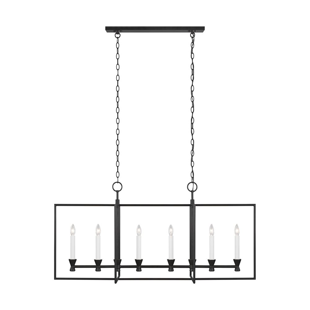 An exposed candelabra pairs with an angular, Aged Iron frame to ensure the Keystone family casts a warm and inviting glow. This series of chandeliers, sconces and pendants designed by Chapman & Myers for Generation Lighting features very detailed construction including bobesches supporting each candle tube. The chandeliers highlight the popular wagon wheel silhouette.