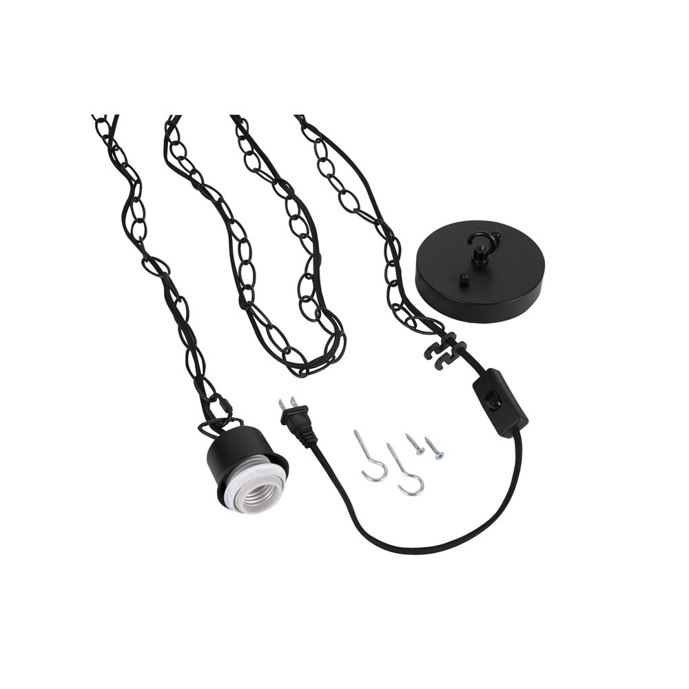Includes 15' black chain, canopy and 15' black cloth covered plug in cord with in-line on/off switch