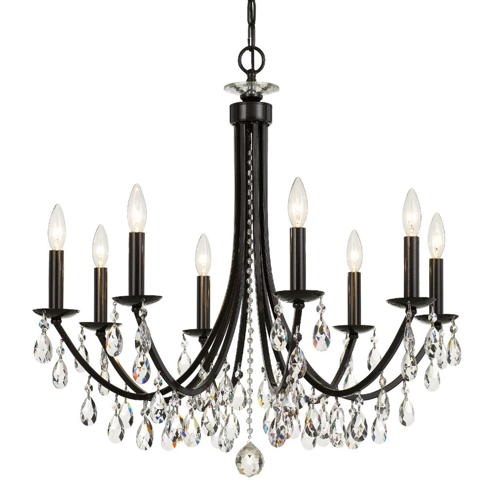A classic yet moderns style with slim, upward curved arms strung in curtains of faceted crystal jewels, create visual interest. Complementary to a variety of home décor styles this chandelier will work in any space.