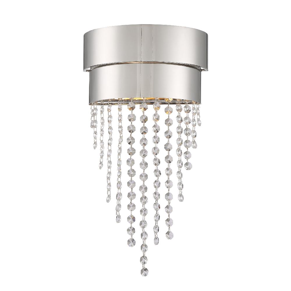 Cascading waterfall of faceted crystal strands are suspended from a polished chrome metal frame creating a dramatic statement in any room. The robust layering of crystals is a brilliant focal point for dressing up modern or contemporary interiors.
