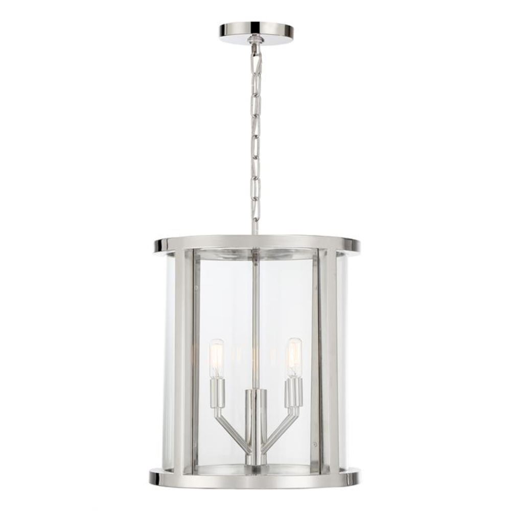 The Devon collection, designed by Libby Langdon, is a study in simple elegance with its clean lines and sleek polished nickel frame. With a variety of sizes, it can work in a myriad of different design styles. Circular at the top and bottom, its intersecting vertical frame sections showcase the fixture's height. The clear glass panels give the perfect peek at the inner angular arms, and the polished nickel finish of the candelabra arms give it a modern twist.