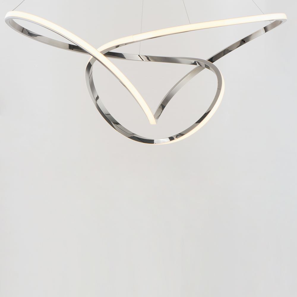Sweeping lines curve and curl in a continuous motion, finished in a rich Brushed Champagne or Black Chrome. Not just a lighting fixture but a sculptural work of art. Gentle illumination moves in all directions for a dramatic lighting effect.