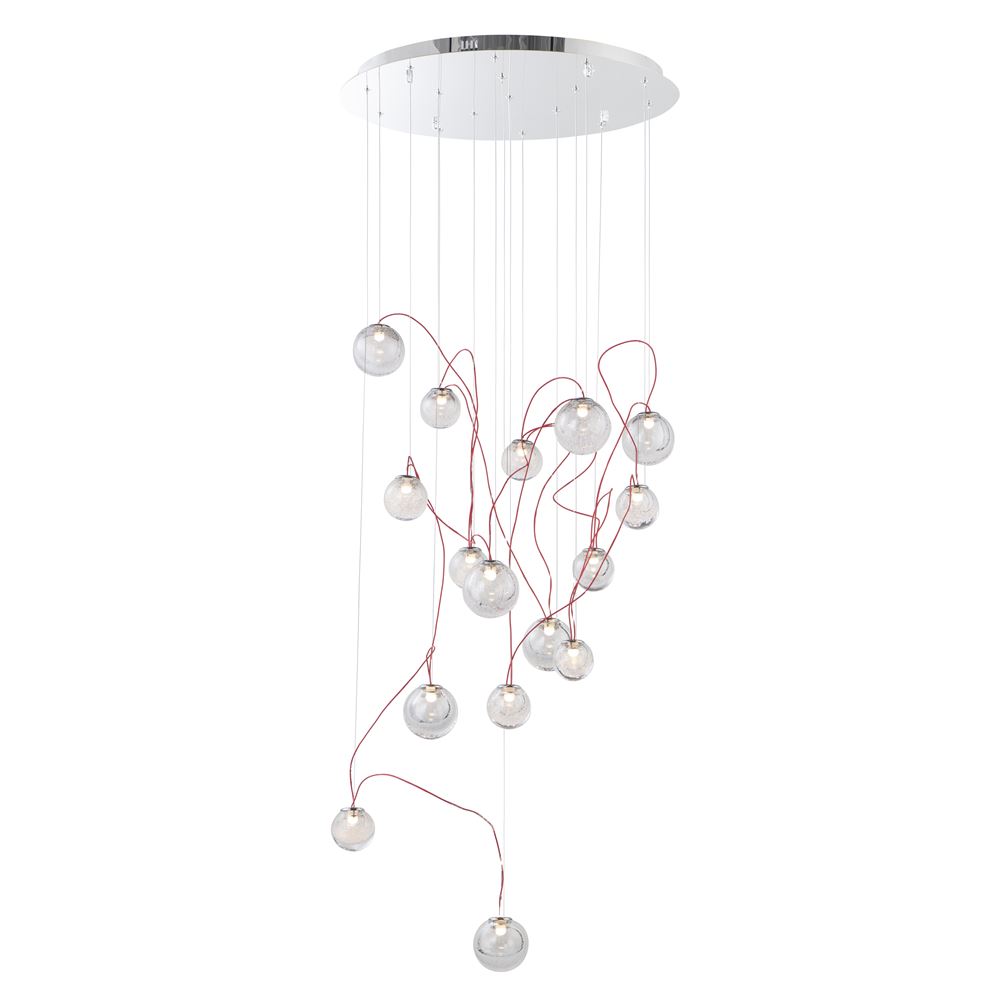 Numerous spheres of heavy Bubble Glass are suspended in an avant-garde fashion connected at various points with a contrasting red cord that creates an artistic impression of light. The Polished Chrome canopy reflects light from the integrated LED in a galaxy-like fashion.
