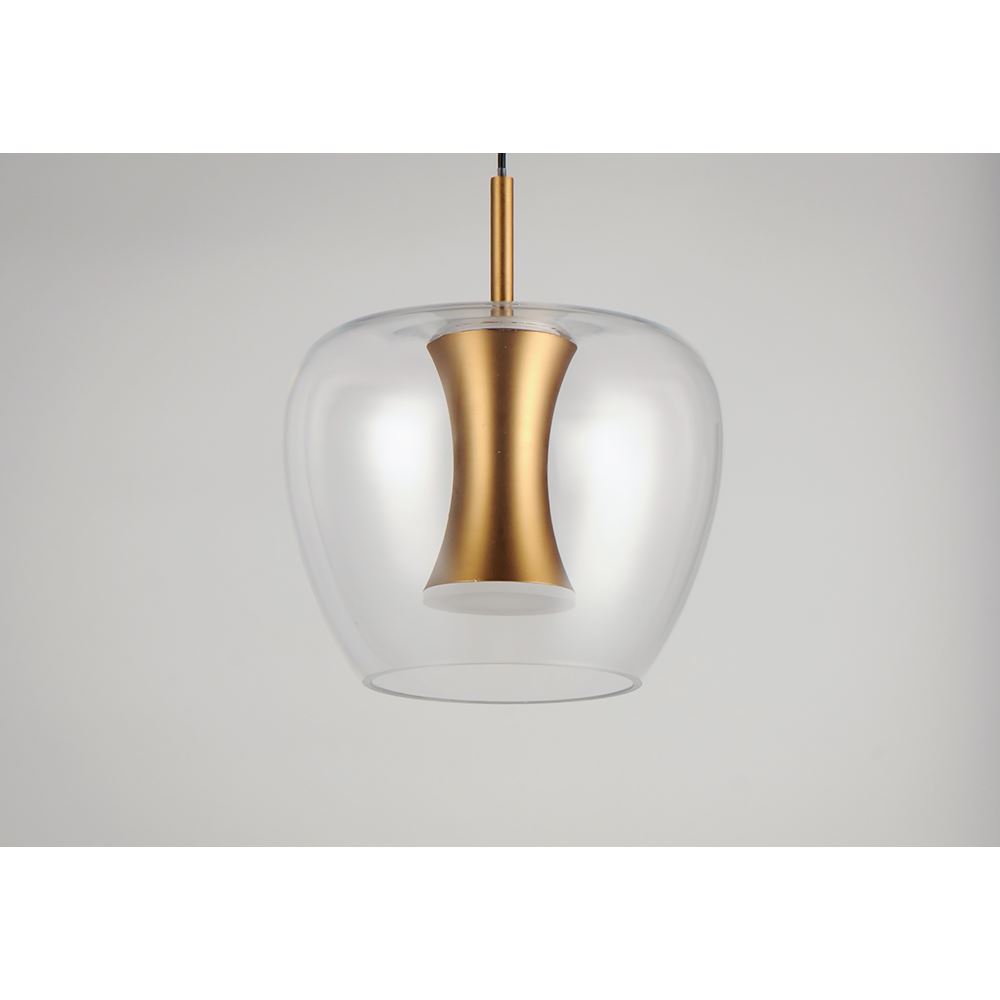 Clear apple shaped glass rest on machined aluminum fonts finished in Satin Brass with integrated LED for even Illumination without the glare. The large scale 25 light comes pre-arranged for ease of installation and is perfect for that tall ceiling application.
