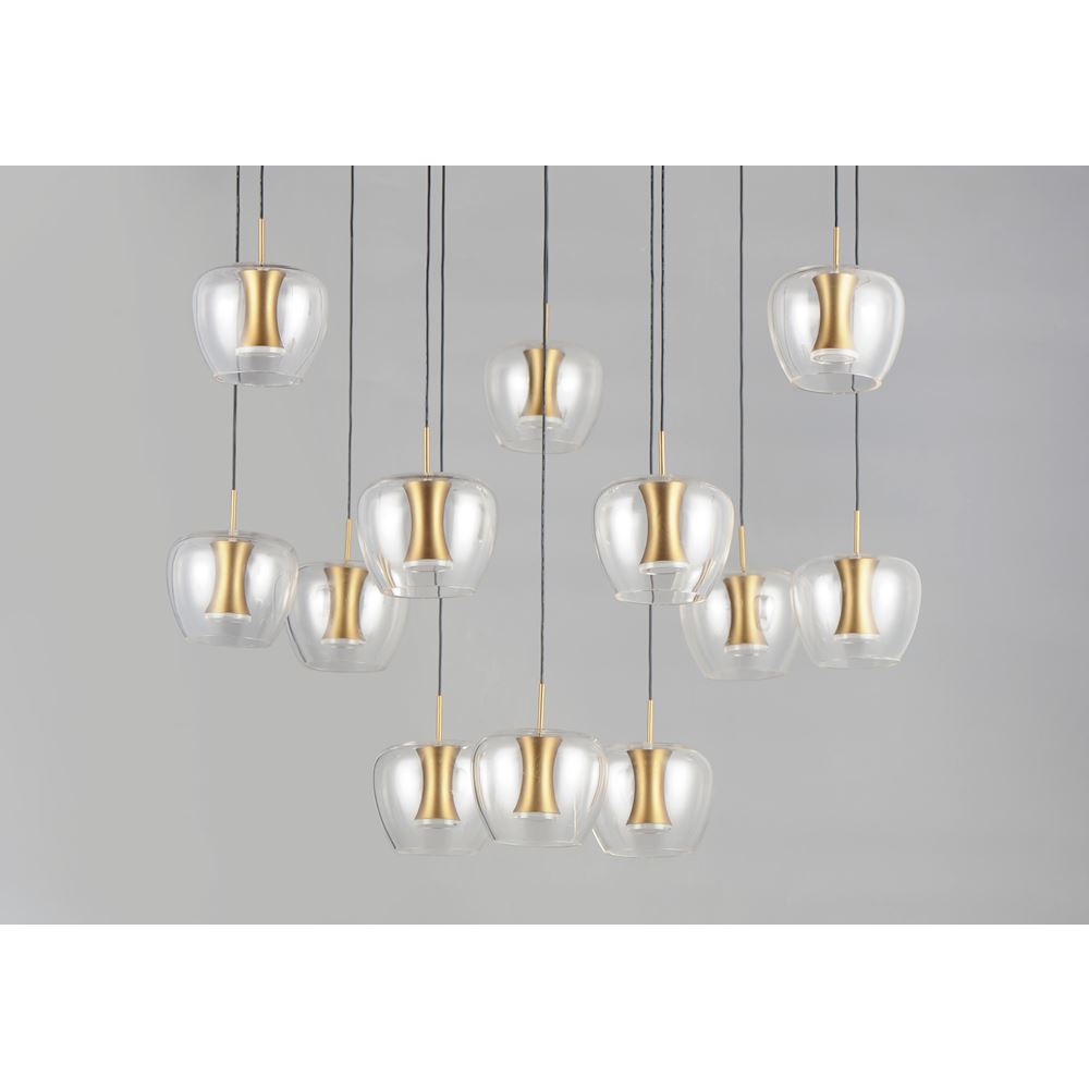 Clear apple shaped glass rest on machined aluminum fonts finished in Satin Brass with integrated LED for even Illumination without the glare. The large scale 25 light comes pre-arranged for ease of installation and is perfect for that tall ceiling application.