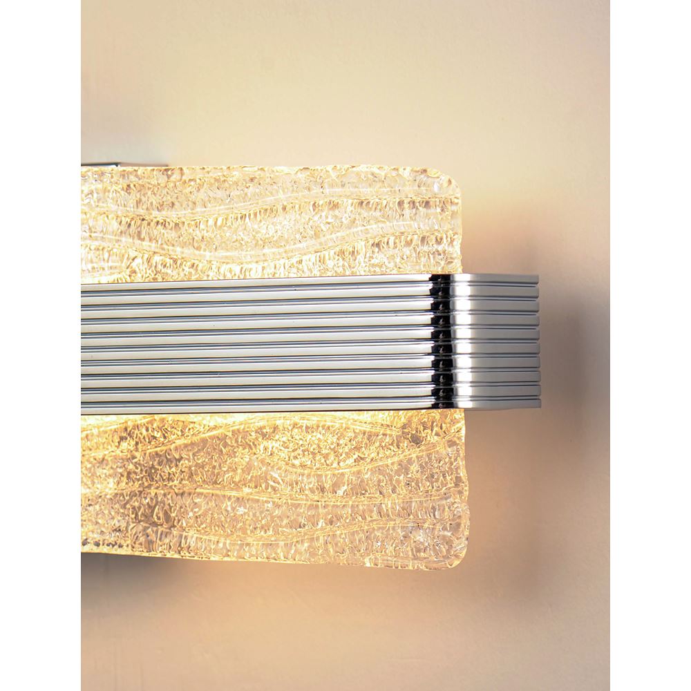 A rippled horizontal bar in Polished Chrome illuminates hand-crafted artisanal Piastra-style glass. The glass's intricate texture creates an interesting light effect on the wall. Can be mounted either vertically as a wall sconce or horizontally over a mirror.