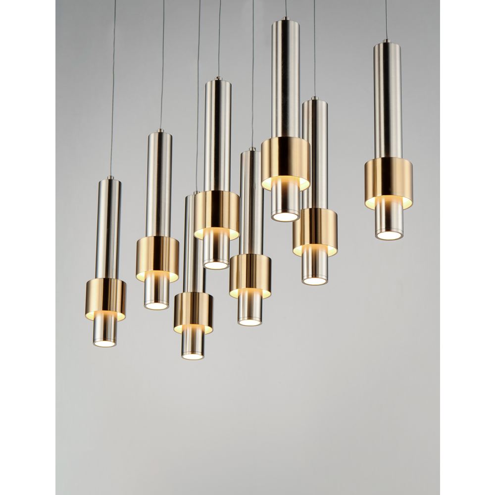 Tubular shaped pendants finished in Satin Nickel with a Satin Brass band provide light from the bottom as well as a reveal behind the band. The soft glow of light from the band creates a beautiful lighting effect not normally seen from similar pendants.