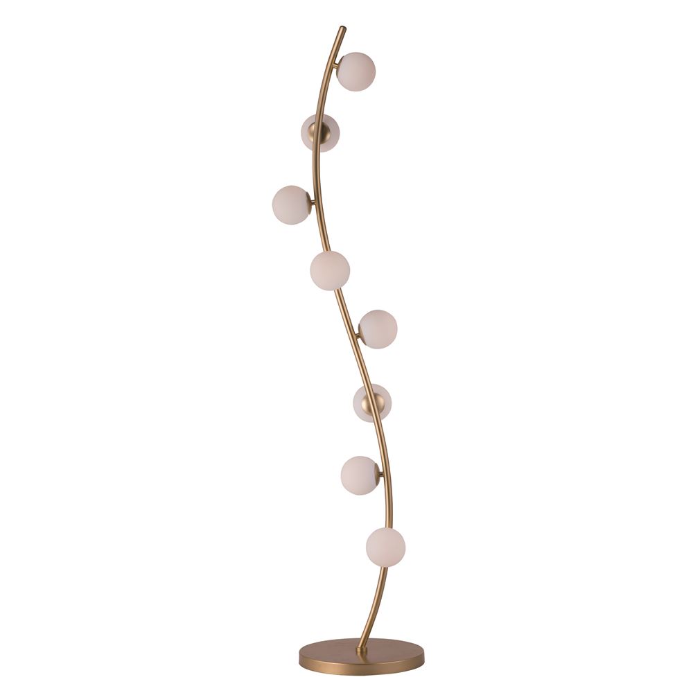 A gently curved, tapered rod finished in Metallic Gold is adorned with several Satin White glass balls and illuminated by integrated LED. The Rover collection is the interpretation of an organically formed brach with buds of white glass that is sure to add elegance to any room.