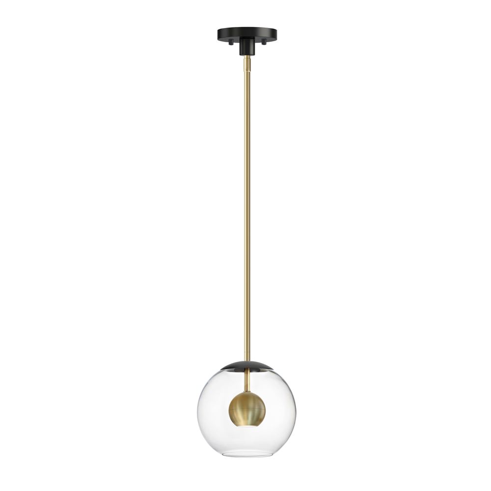 Three sizes of thick Clear glass orbs are suspended displaying a small aluminum sphere encompassed within. Discretely recessed dedicated LED provides ample lighting without glare. Branching out from a central structural column, the striking Black and Satin Brass combination an additional LED light source directs light downward. These atomically inspired fixtures are sure to make a statement.