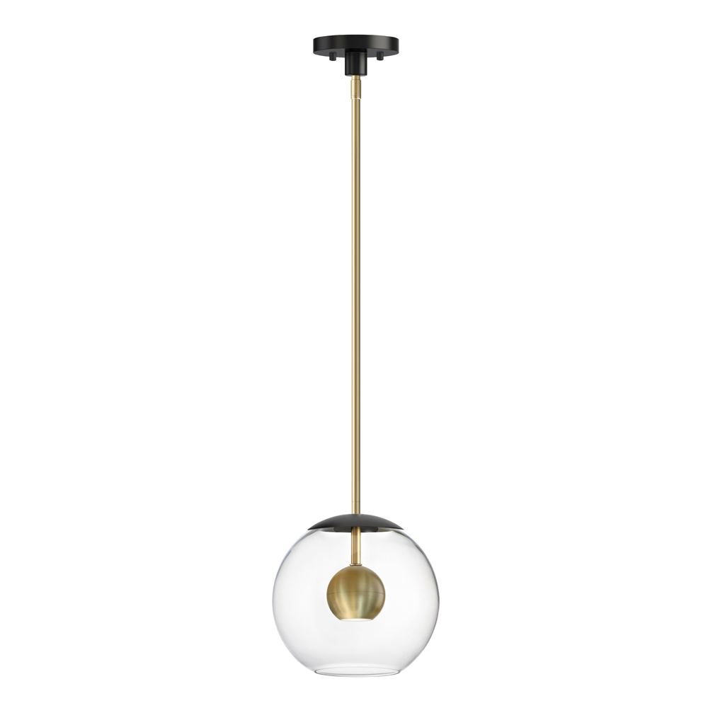 Three sizes of thick Clear glass orbs are suspended displaying a small aluminum sphere encompassed within. Discretely recessed dedicated LED provides ample lighting without glare. Branching out from a central structural column, the striking Black and Satin Brass combination an additional LED light source directs light downward. These atomically inspired fixtures are sure to make a statement.