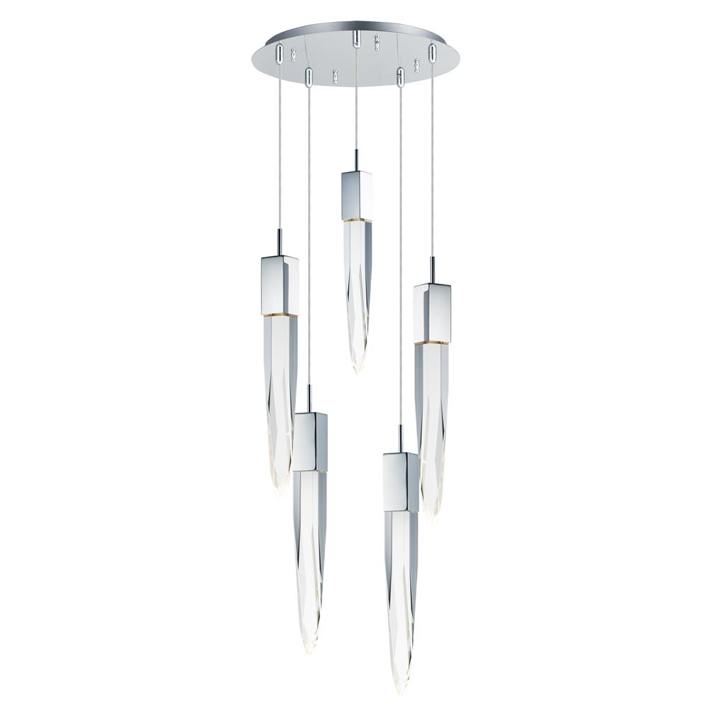 Stalactites of Clear Beveled crystal suspend from your choice of Polished Chrome or Black supports, can be hung at various heights to create a spectacular array. The crystal shimmers as light diffuses through the facets powered by 90 CRI LED dimmable modules.