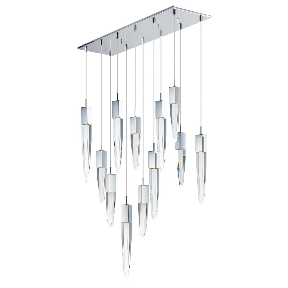 Stalactites of Clear Beveled crystal suspend from your choice of Polished Chrome or Black supports, can be hung at various heights to create a spectacular array. The crystal shimmers as light diffuses through the facets powered by 90 CRI LED dimmable modules.