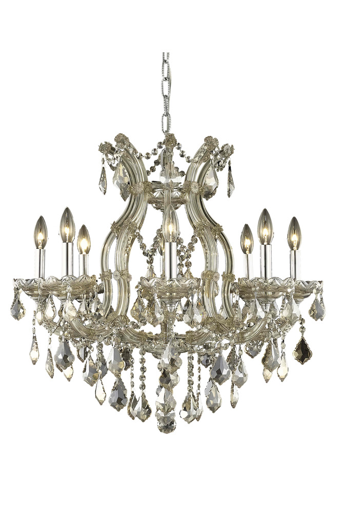 This Maria Theresa 9-LT Golden Teak Chandelier Golden Teak Royal Cut Crystal from Elegant has a finish of Golden Teak and fits in well with any Transitional style decor.