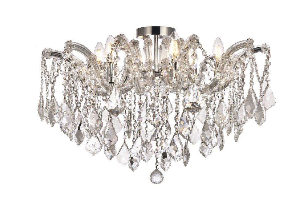 This Maria Theresa 6-LT Chrome Flush Mount Clear Royal Cut Crystal from Elegant has a finish of Chrome and fits in well with any Traditional style decor.