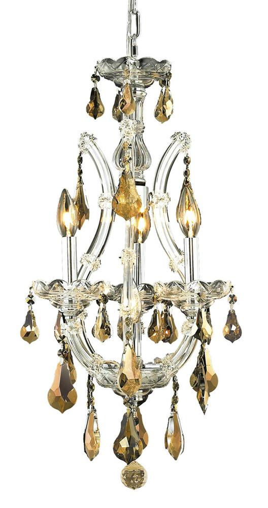 This Maria Theresa 4-LT Chrome Chandelier Golden Teak Royal Cut Crystal from Elegant has a finish of Chrome and fits in well with any Transitional style decor.