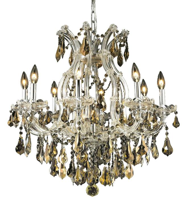 This Maria Theresa 9-LT Chrome Chandelier Golden Teak Royal Cut Crystal from Elegant has a finish of Chrome and fits in well with any Transitional style decor.