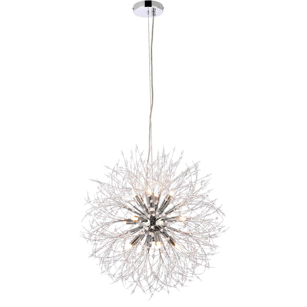 Solace collection features clear crystal beads strung on thin chome wires bursting from the center. The modern pendant is an eye-catching design that embellished with several clear crystals transforming the luminous globe to a work of art. Make a statement or set the mood in your living room, dining room, or foyer with this gorgeous style.