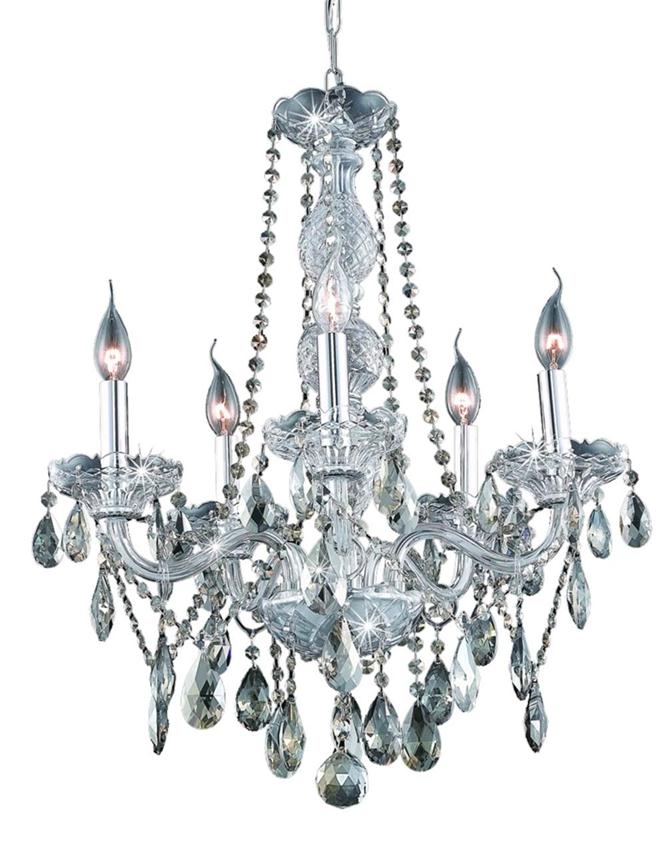 This Verona 5-LT Chrome Chandelier Golden Teak (Smoky) Royal Cut Crystal from Elegant has a finish of Chrome and fits in well with any Transitional style decor. Room Use: Dining Room; Living Room; Bedroom; Bathroom; Entry Way; Closet