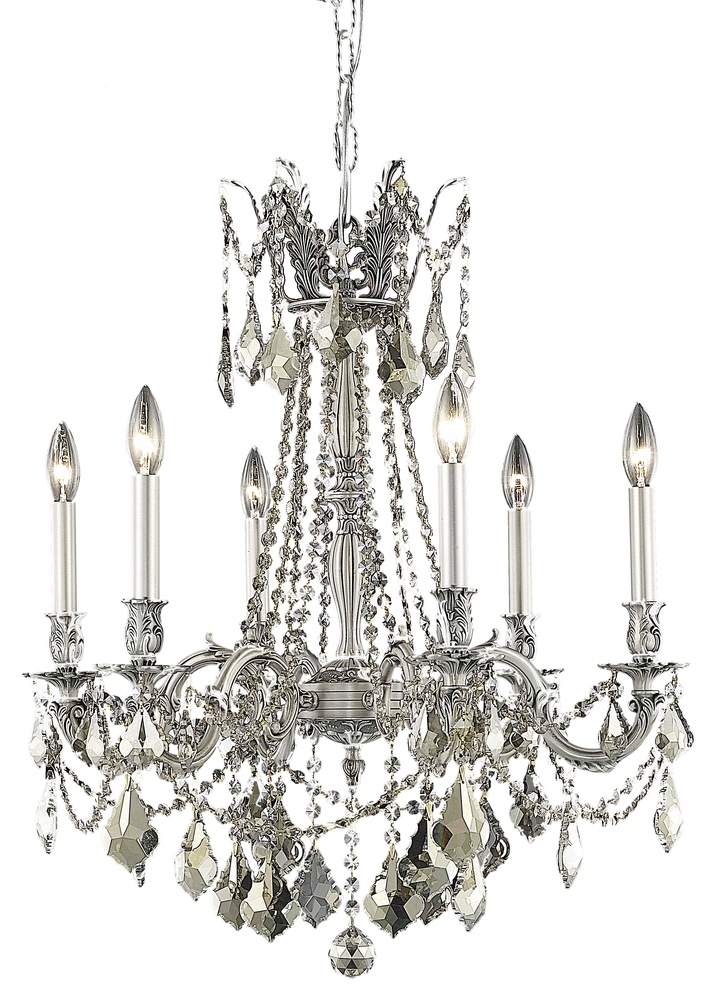 This Rosalia 6-LT Pewter Chandelier Golden Teak (Smoky) Royal Cut Crystal from Elegant has a finish of Pewter and fits in well with any Traditional style decor.