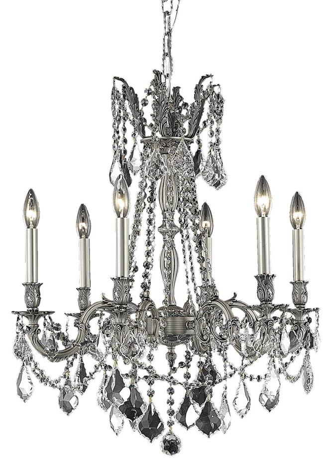 This Rosalia 6-LT Pewter Chandelier Clear Royal Cut Crystal from Elegant has a finish of Pewter and fits in well with any Traditional style decor.
