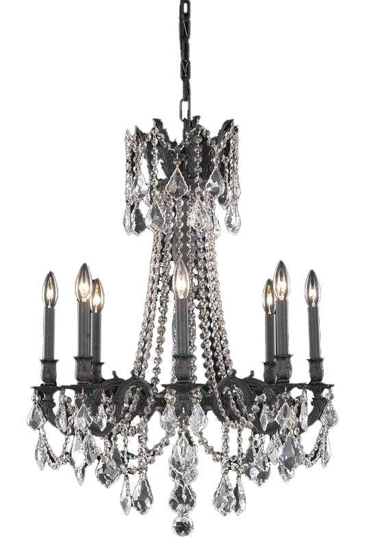 This Rosalia 8-LT Dark Bronze Chandelier Clear Royal Cut Crystal from Elegant has a finish of Dark Bronze and fits in well with any Traditional style decor.