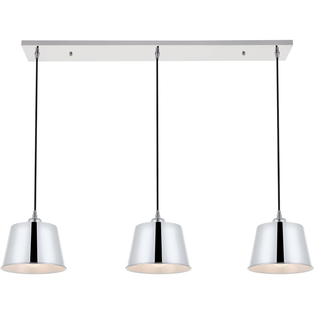 Contemporary and minimalistic chrome finish 3-light pendant light with drum shaped shade suspended from a rectangular canopy