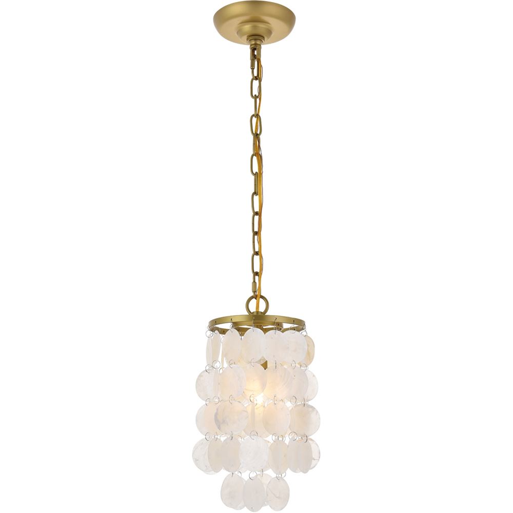 The gentleness of the Selene collection pendant lamp in a brass finish elicits the calm temperament of the moon and the coy-- yet soothing, light it emits. Weaving through the myriad of the draped shell curtains, the illumination creates a new design every time, whether it is the shadows and highlights that changes with the direction of the light, just as the moon goes through its phases, or the shadows casted with every slight movement of the white shells.