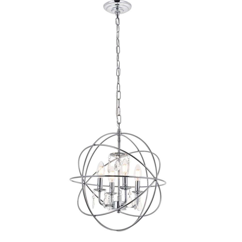 Chrome finish open gyroscopic frame with suspended crystals hanging from the bobeche, offering a stylish old world charm