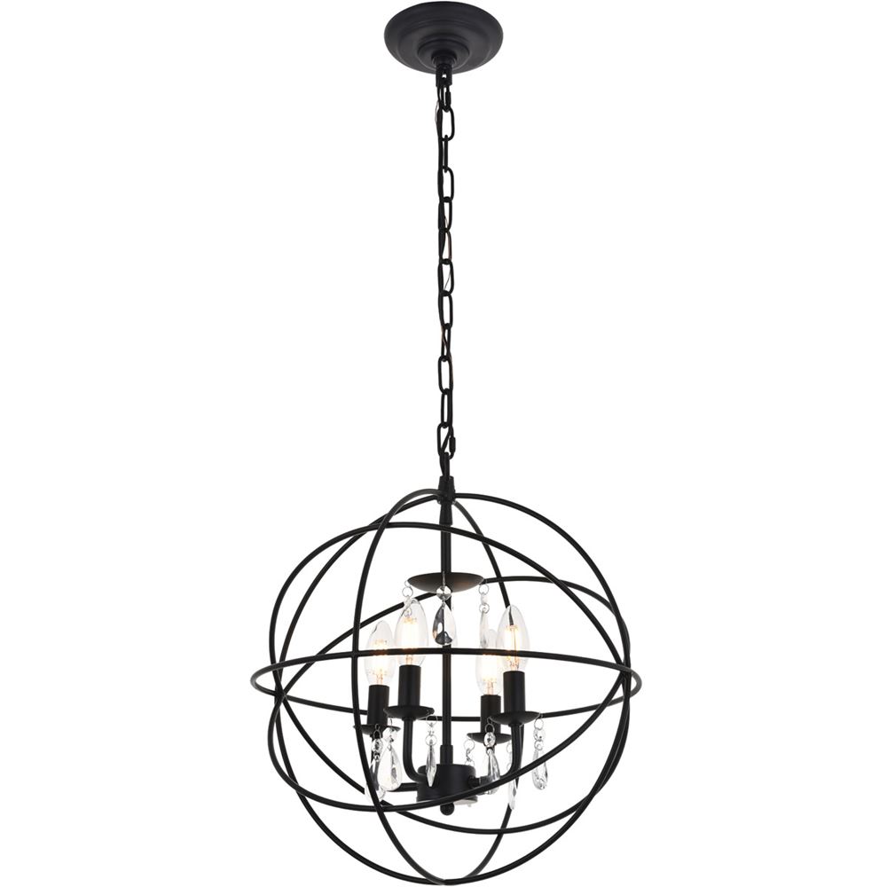 Matte black finish open gyroscopic frame with suspended crystals hanging from the bobeche, offering a stylish old world charm