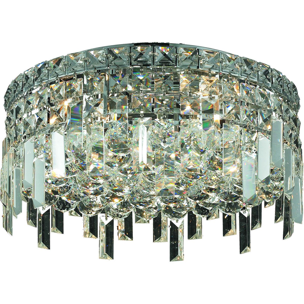 This Maxime 5-LT Chrome Flush Mount Clear Royal Cut Crystal from Elegant has a finish of Chrome and fits in well with any Contemporary style decor.