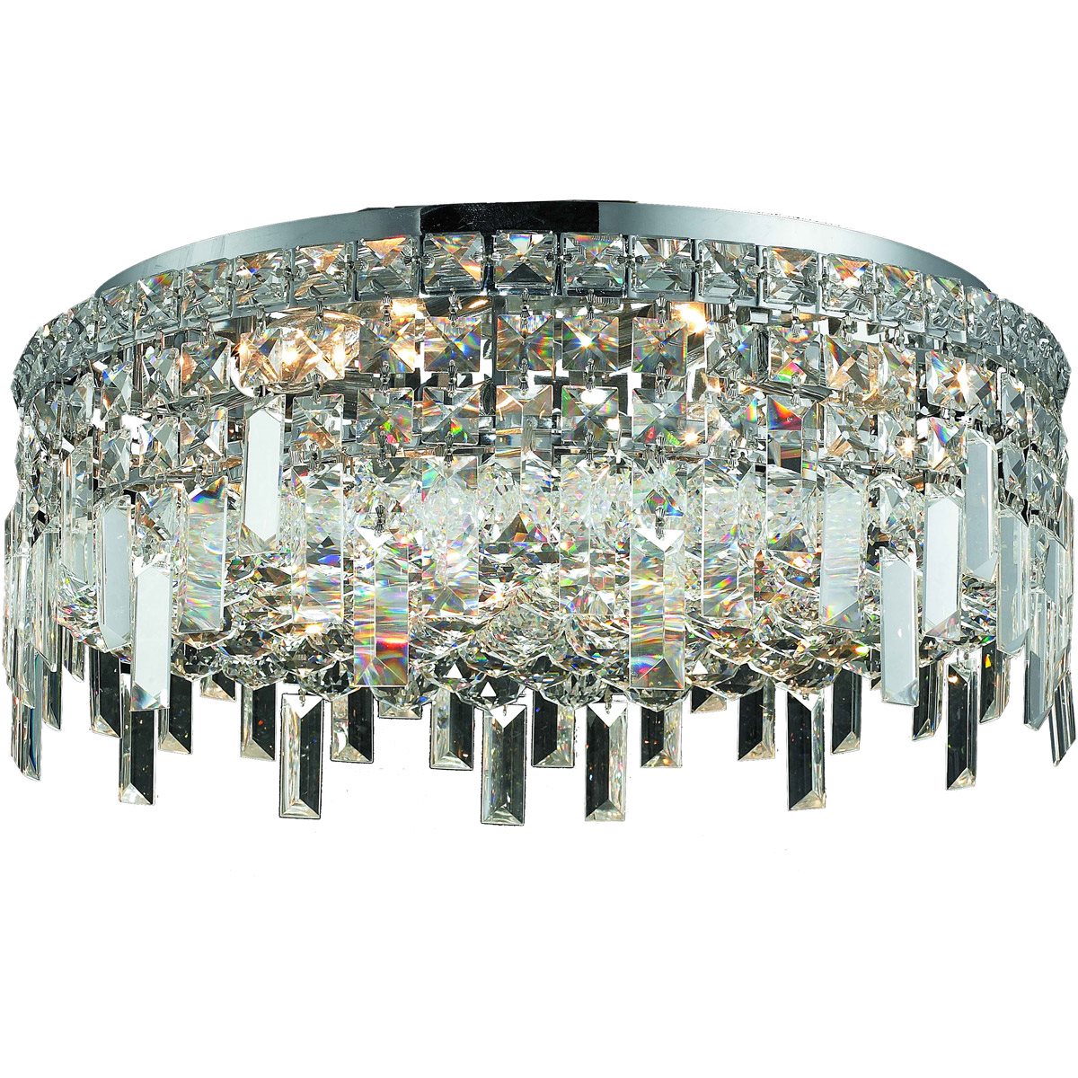 This Maxime 6-LT Chrome Flush Mount Clear Royal Cut Crystal from Elegant has a finish of Chrome and fits in well with any Contemporary style decor.