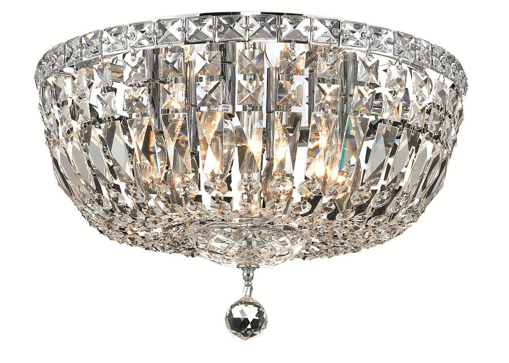 This Tranquil 6-LT Chrome Flush Mount Clear Royal Cut Crystal from Elegant has a finish of Chrome and fits in well with any Transitional style decor.
