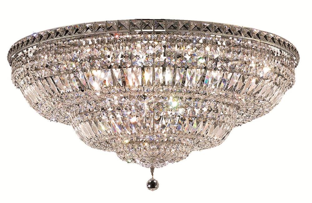This Tranquil 21-LT Chrome Flush Mount Clear Royal Cut Crystal from Elegant has a finish of Chrome and fits in well with any Transitional style decor.