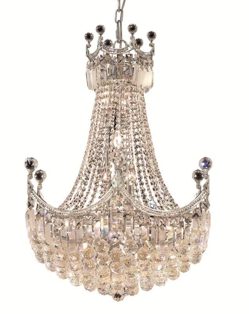 This Corona 18-LT Chrome Chandelier Clear Royal Cut Crystal from Elegant has a finish of Chrome and fits in well with any Transitional style decor.