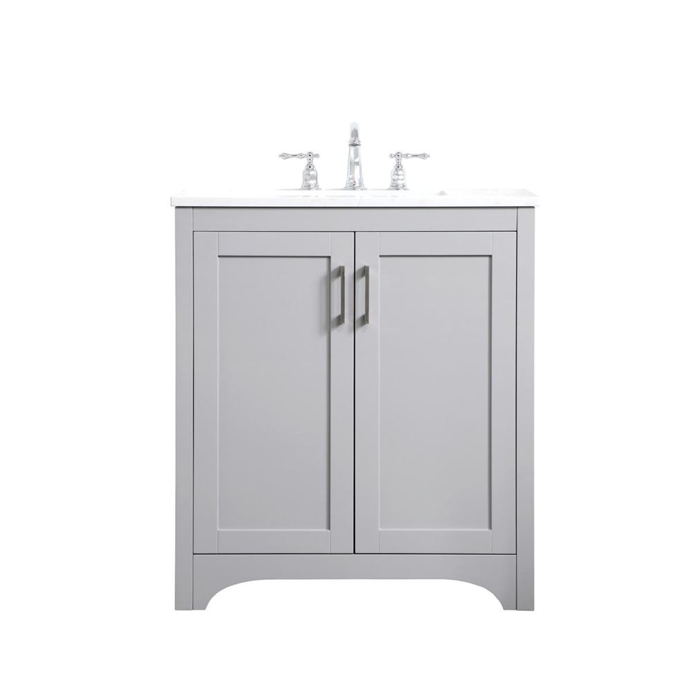 The refined simplicity of this 30" grey finish vanity creates a peaceful, yet stylish, atmosphere. Its traditional modernity adds a mature beauty that will elevate any bathroom or powder room--the Calacatta quartz counter top adds refined luxe while the brushed nickel handle bars open the two cabinet doors, revealing ample storage space to store and hide away an assortment of bathroom essentials. Whether your home is large or small, this vanity will surely fit in well.