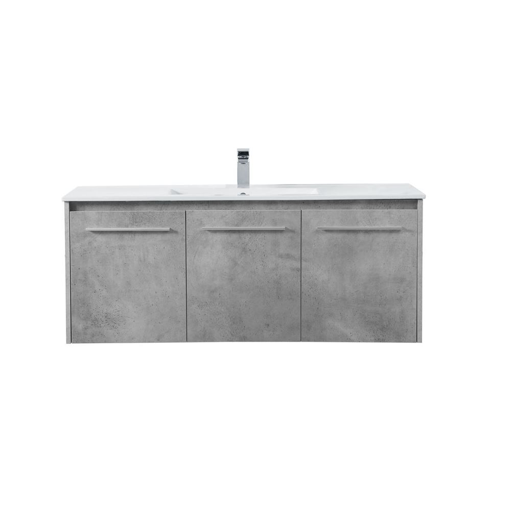 The contemporary simplicity of this 48" floating vanity in a concrete grey finish will help open the space and add stunning modern flair to your bathroom or powder room. The open space below makes it easy to show off your tiles and to clean the floor with ease--it's also the perfect place for a hamper. 3 doors open to reveal plentiful of storage pace to store all of your bathroom miscellany. The clean lines that permeate through the design will surely create a fresh look in your home.