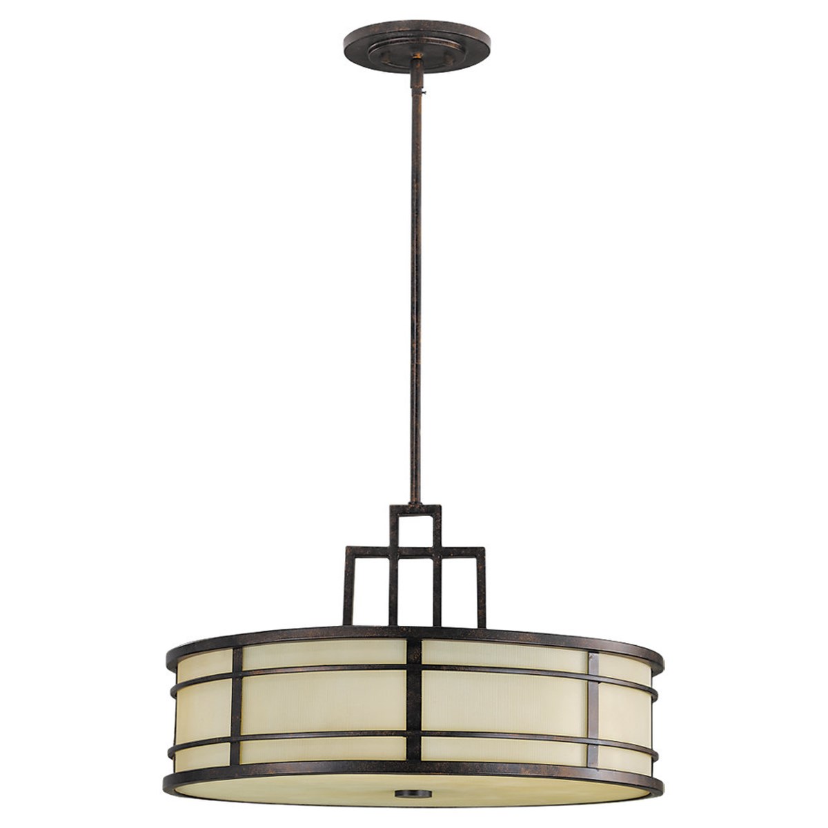 Elements from both Asian and Arts & Crafts styles combine to create the design inspiration of vertical and horizontal linear banding creates a beautiful contrast against the Amber Ribbed glass shades and diffuser.