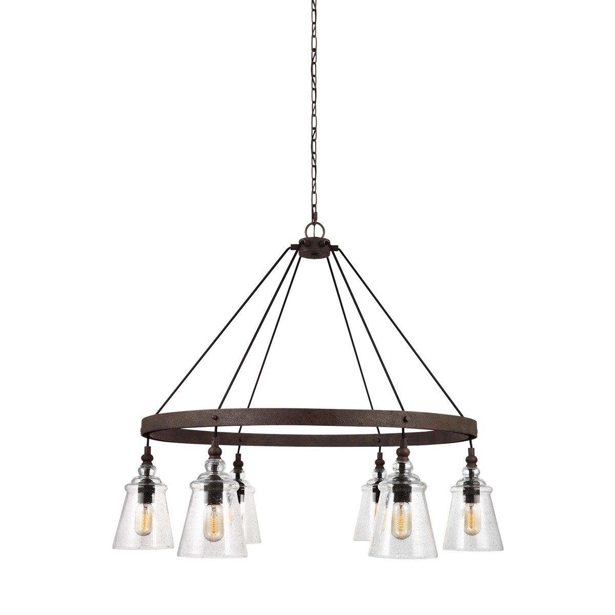 Loras is a contemporary take on historic, industrial designs. The transitional chandeliers feature multiple corded pendants beautifully suspended on either a Dark Weathered Iron or Chrome-finished frame. Clear Seeded glass shades on black fabric cords add dimension and charm to this vintage-inspired silhouette.
