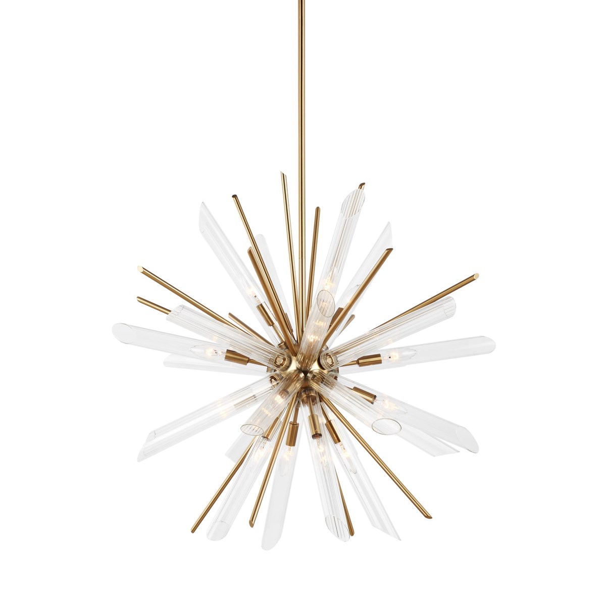 The Quorra contemporary light fixture by Feiss delivers a burst of energy as a completely modern interpretation of a traditional crystal chandelier, with a bit of Mid-Century modern inspiration.