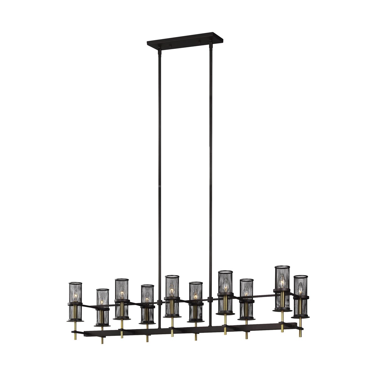 The elongated Burnished Brass candle stems of Palmyra shine in gilded contrast to the Oil Rubbed Bronze finish. Palmyra provides an air of refined masculinity and streamlined sophistication as light gently diffuses through cylindrical metal mesh shades.