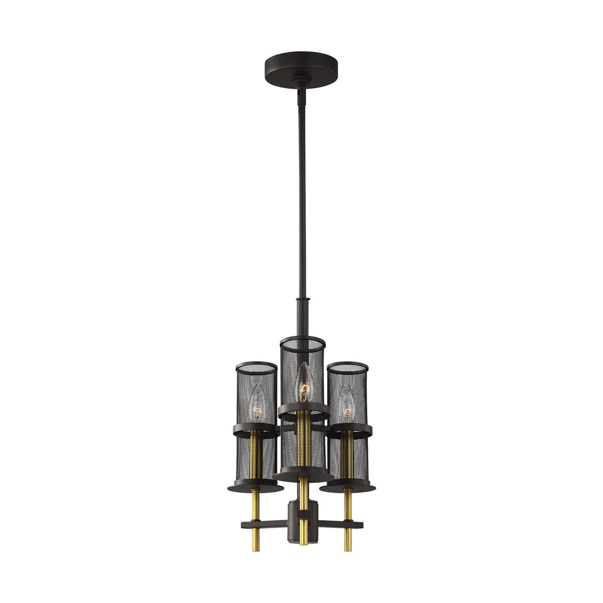 The elongated Burnished Brass candle stems of Palmyra shine in gilded contrast to the Oil Rubbed Bronze finish. Palmyra provides an air of refined masculinity and streamlined sophistication as light gently diffuses through cylindrical metal mesh shades.