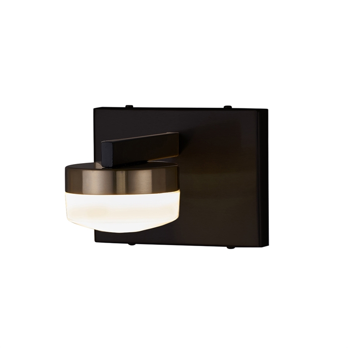 This Puck 1-LT LED Wall Sconce from Justice Design's Evolv line has a finish of Matte Black w/ Brass Accents and fits in well with any Contemporary style decor.