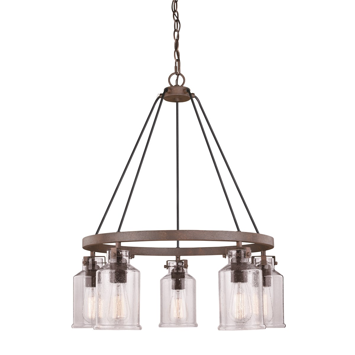 This rustic inspired soft industrial collection called Milone produces a bold statement. The textured rust finish together with the clear seeded glass are artistically combined to create an ageless appeal with a modern twist. This complete collection includes a Chandelier, Medium Sized Pendant, Mini Chandelier, Mini Pendant, and Semi-Flush Mount to meet your lighting needs. Beautiful and bold this collection is the perfect addition to any interior space from farmhouse to urban.