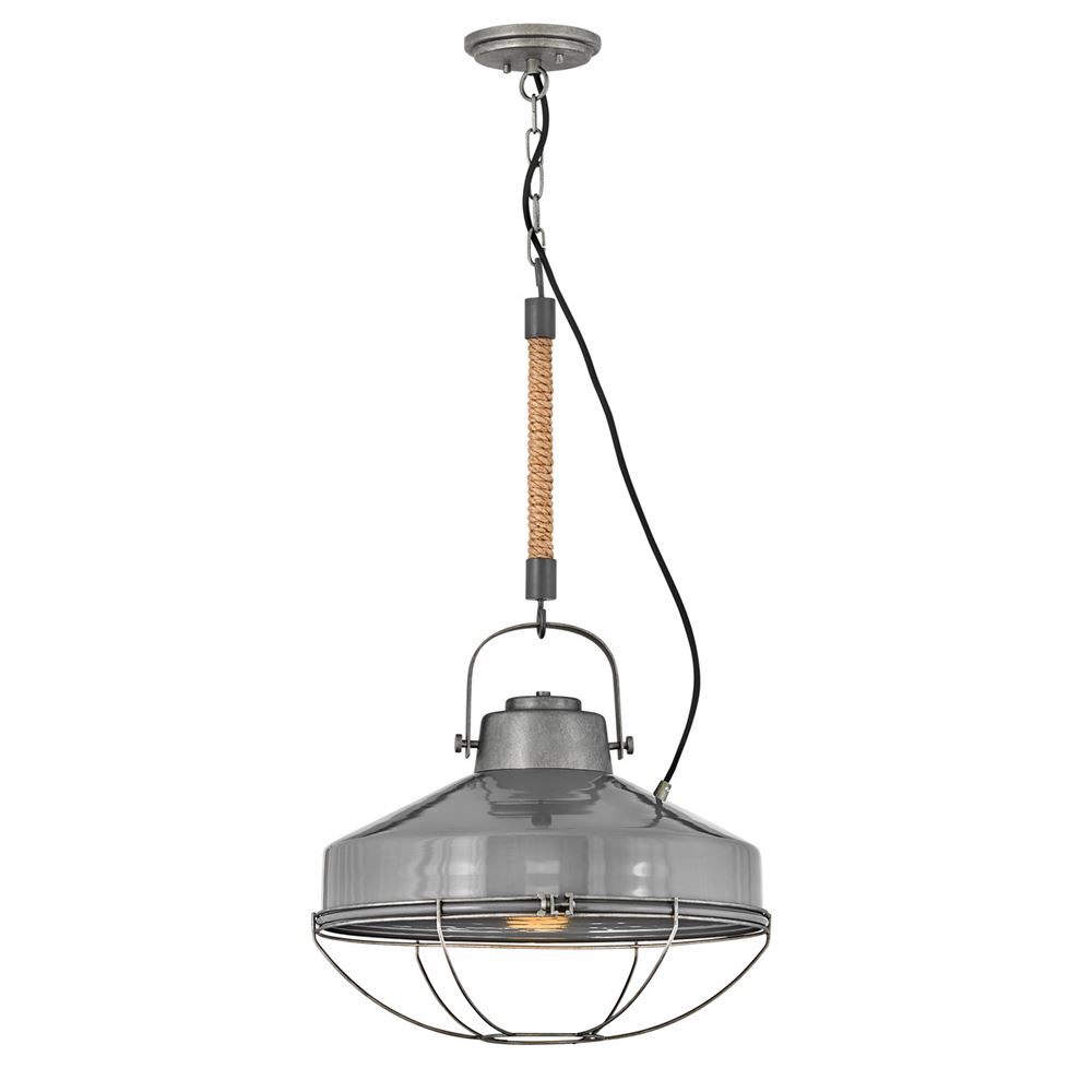 The ideal balance of modern and rustic, Brooklyn has it all. Its bold, rugged construction is complemented by a rope and hook stem, while its clean, metal shade holds an airy, wire cage. Offered in Burnished Bronze with Polished White and Rustic Pewter with French Gray, Brooklyn is authentic industrial design.