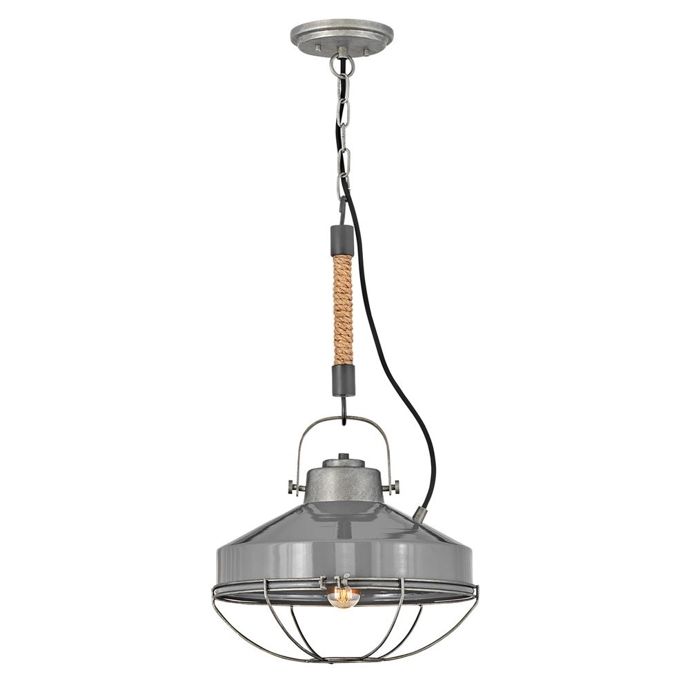 The ideal balance of modern and rustic, Brooklyn has it all. Its bold, rugged construction is complemented by a rope and hook stem, while its clean, metal shade holds an airy, wire cage. Offered in Burnished Bronze with Polished White and Rustic Pewter with French Gray, Brooklyn is authentic industrial design.